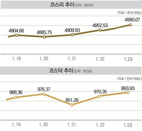 다만, 5000을 지키는 건 생각보다 쉽지 않았다. 투자자의 매도세에 코스피지수는 이날 4952.53으로 거래를 마쳤다. 다음날 추이도 비슷했다. 23일 코스피지수는 장 시작과 함께 상승세를 타기 시작했고, 오전 9시 20분께 다시 5000 고지를 밟았지만 종가까지 유지하진 못했다. 오후 들어 하락세로 돌아선 코스피지수는 이날 4990.07로 한주를 마감했다.