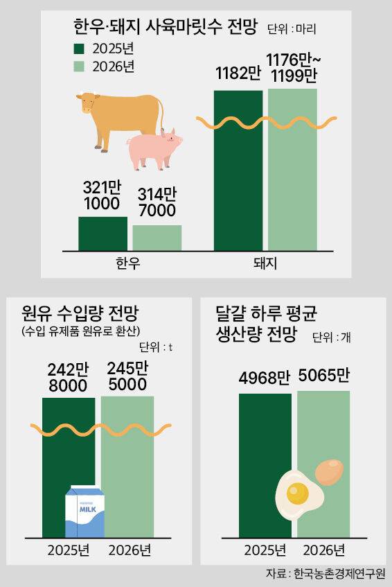 ◆한우=한국농촌경제연구원은 22일 ‘농업전망 2026’에서 올해 한우 사육마릿수를 314만7000마리로 내다봤다. 지난해보다 2.0% 줄어든 수준으로 2세 미만 사육마릿수 감소가 영향을 끼친 것으로 분석된다.
