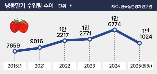 한국농촌경제연구원 ‘농업전망 2026’에 따르면 외국산 냉동딸기 수입량은 1만1024t으로 잠정 집계됐다. 냉동딸기 수입량은 꾸준히 늘어 2022년 1만2217t으로 1만t을 넘어섰다. 2021∼2025년 5년간 연평균 수입량은 1만2360t으로, 10년 전인 2015년(7659t) 대비 61.3% 급증했다. 농경연 측은 “지난해 수입량이 한풀 꺾인 것은 2024년 수입물량이 남아 있는 데다 최근 원달러 환율이 오른 영향”이라고 분석했다.