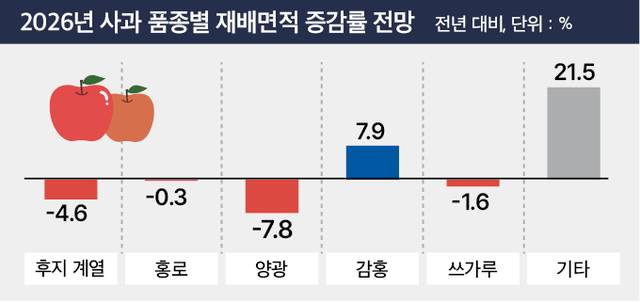 2026년산 사과 재배면적은 품종별로 희비가 교차할 것으로 보인다. 만생종 ‘후지’ 계열은 전년보다 4.6% 감소하고, ‘감홍’은 7.9% 증가할 것으로 관측됐다.