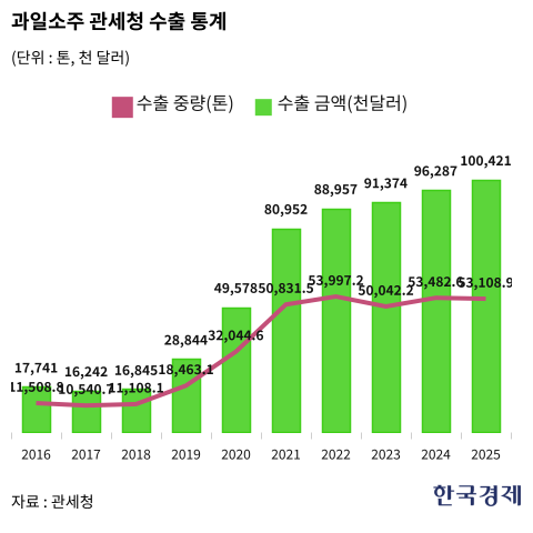 과일소주 수출은 2019년 2844만달러에 그쳤지만 이듬해인 2020년엔 4957만달러, 2022년엔 8895만달러, 2025년 1억42만달러까지 늘어났다.
