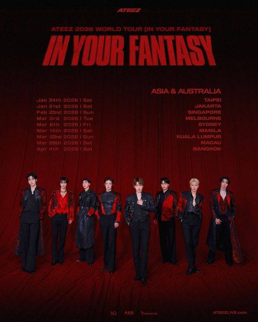 에이티즈의 '인 유어 판타지' 아시아, 호주 투어는 24일 타이베이, 31일 자카르타, 2월 22일 싱가포르, 3월 3일 멜버른, 6일 시드니, 14일 마닐라, 22일 쿠알라룸푸르, 28일 마카오, 4월 4일 방콕에서 펼쳐진다.