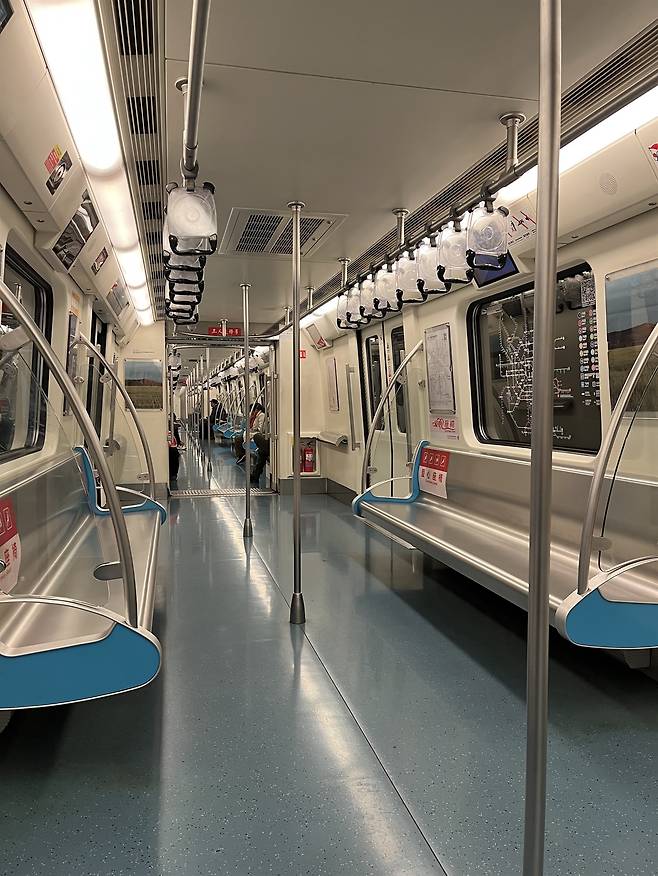 | ▲ 퇴근 시간 직후 승객이 썰물처럼 빠져나간 뒤 지하철 내부의 모습. 청두 시민들의 발인 지하철은 빠르고, 정확하고, 깨끗하고, 무엇보다 요금이 쌌다. 쓰촨성의 상징인 판다의 모습을 한 손잡이가 이채롭다. |