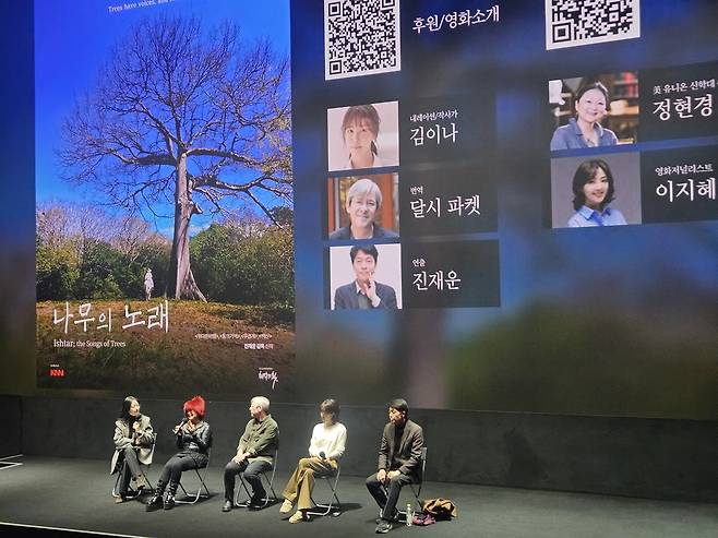 현경 교수의 <연약함의 힘>이라는 책에서 소개되었던 공주님의 이야기가 몇 년에 걸쳐 영화로 만들어진 이야기, 김이나 작가가 흔쾌히 내레이션을 수락했다는 이야기, 전갈에 쏘이는 등 여러 고생을 하며 만들었다는 이야기 등 영화의 뒷이야기도 재미가 쏠쏠했다. 즉석에서 QR 코드로 만들어진 오픈채팅방에는 가슴 뜨거운 감상평이 실시간으로 올라왔다. 최근 넷플릭스 시리즈 <흑백요리사>에 출연했던 선재 스님도 감상을 나눠주었고, 영화 <수라>에 출현했던 정희정 님은 수라의 대사 "아름다움을 본 죄"를 언급하며, 이런 영화들이 100개의 극장 등을 통해 더 많은 사람들에게 전해질 수 있으면 좋겠다고 했다.