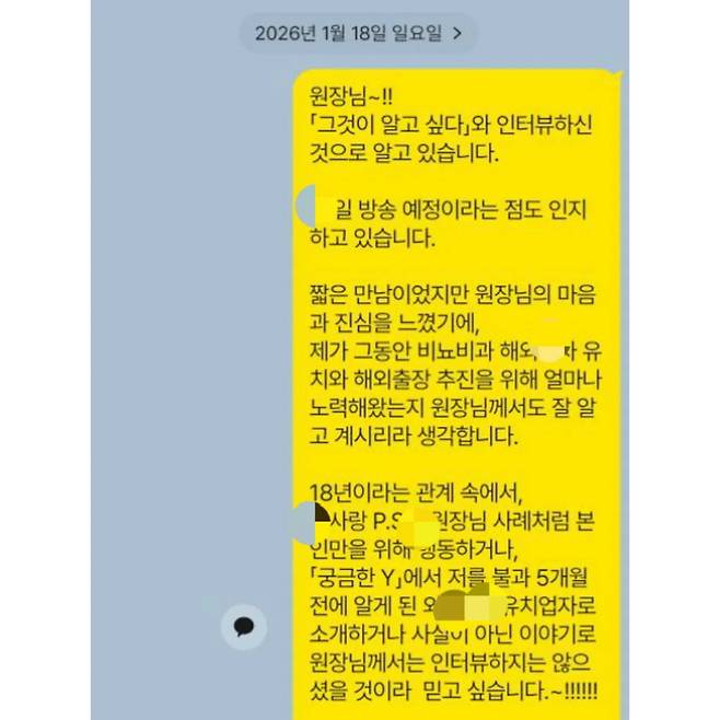 A씨는 24일 자신의 사회관계망서비스(SNS)를 통해 “기자님들 자극적인 키워드로 적당히 기사 좀 쓰세요”라며 최근의 논란과 관련해 추가 입장을 밝혔다. 공개된 사진에는 ‘그것이 알고 싶다’ 제작진과 인터뷰를 진행한 것으로 알려진 ‘꽈추형’ 비뇨의학과 홍성우 원장과의 카카오톡 대화 캡처본이 담겼다.
