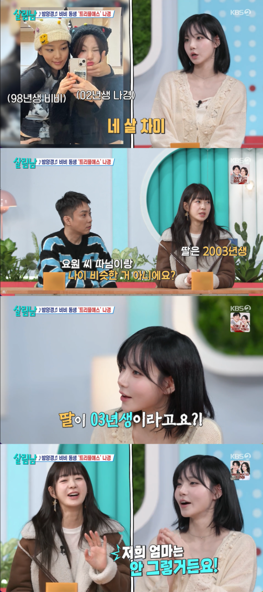 나경은 ‘밤양갱’ 열풍의 주인공인 가수 비비의 친동생이라고. 나경은 언니 비비와의 나이 차이를 묻는 질문에 “4살 차이가 난다. 언니는 98년생이고 저는 02년생”이라고 답했다. 이를 듣던 은지원은 이요원을 향해 “요원 씨 따님이랑 나이가 비슷한 거 아니냐”고 질문을 던졌다.