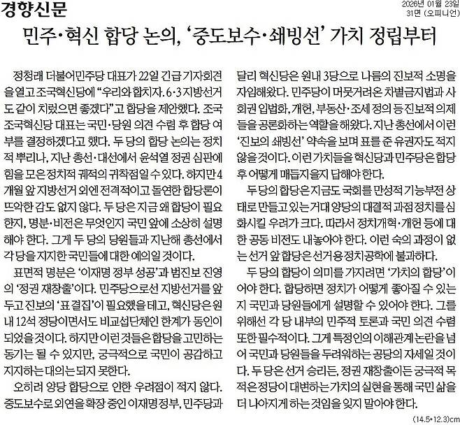 흥미로운 분석입니다. 마무리하겠습니다. 정치인들은 선거에서 이기기 위해 이합집산을 하지만 유권자는 정치인들의 의도대로 움직이지 않는 경우가 많습니다. 따라서 합당을 할 때는 정치 공학보다 가치가 더 중요할 수 있습니다. 경향신문이 23일 치에 “민주·혁신 합당 논의, ‘중도보수·쇄빙선’ 가치 정립부터”라는 사설을 실었습니다.