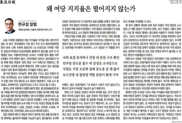 한규섭 서울대 교수가 1월20일 치 동아일보에 “왜 여당 지지율은 떨어지지 않는가”라는 제목의 칼럼을 썼습니다.