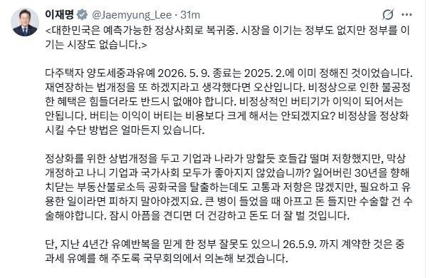 이 대통령은 25일 엑스(X·구 트위터)에 "대한민국은 예측가능한 정상 사회로 복귀 중. 시장을 이기는 정부도 없지만 정부를 이기는 시장도 없다"며 이같이 밝혔다. 그러면서 "다주택자 양도세 중과 유예 5월 9일 종료는 지난해 2025년 2월에 이미 정해진 것이었다"라며 "비정상으로 인한 불공정한 혜택은 힘들더라도 반드시 없애야 한다"고 강조했다.