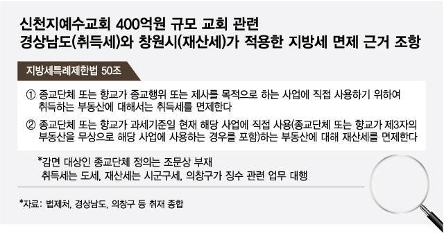 머니투데이 취재 결과, 신천지는 지난해 5월 창원 의창구 소재 신천지 부산야고보지파 마산교회를 A부동산개발회사로부터 403억원에 인수했다. 이 과정에서 의창구는 신천지예수교회에 대해 수십억원으로 추정되는 취득세를 전액 감면하고 같은해 6월1일이 과세기준일인 재산세도 면제했다. 종교단체·향교에 대한 세금 면제 조항이 담긴 지방세특례제한법 제50조 적용대상이라고 판단한 것이다. 의창구는 도세인 취득세와 시군구세인 재산세 업무를 각각 경남도, 창원시로부터 위탁받은 기관이다. 취득세율 4%를 적용하면 16억여원을 신천지 측이 감면받은 것이며 매해 부과되는 재산세까지 합산하면 감면 규모는 더 커진다.
