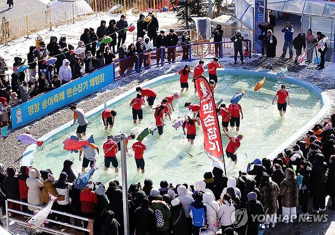 (서울=연합뉴스) 25일 강원도 평창군 오대천 일원에 열린 평창송어축제를 찾은 방문객들이 송어 맨손 잡기 체험을 즐기고 있다. 2026.1.25 [평창관광문화재단 제공. 재판매 및 DB 금지]