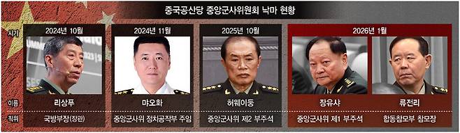 시진핑 중국 국가주석이 중국군 2인자까지 부패 척결의 대상으로 삼으면서 군 수뇌부 6명 가운데 5명이 낙마했다. 시 주석은 더욱 막강한 군부 권력을 쥐게 됐지만, 동시에 전력 약화라는 위험을 안게 됐다.