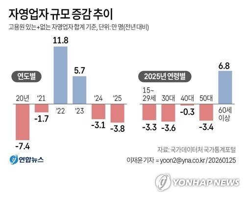 (서울=연합뉴스) 이재윤 기자 = 25일 국가데이터처 국가통계포털에 따르면 지난해 취업자 가운데 자영업자는 562만명으로 전년보다 3만8천명 줄면서 코로나19 사태 당시인 2020년 이후로 5년만에 감소폭이 가장 컸다.