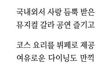 미식 코스는 든든하게 뒤를 받친다. 라이브 스테이션을 포함해 생선 요리, 스테이크 등 코스 구성 음식을 뷔페 형태로 선보인다. 공연 관람 전후로 풍성하고도 여유로운 다이닝을 즐길 수 있도록 배려한 것. 뷔페에는 샴페인 2종, 레드 와인 2종 등이 함께 나온다.
