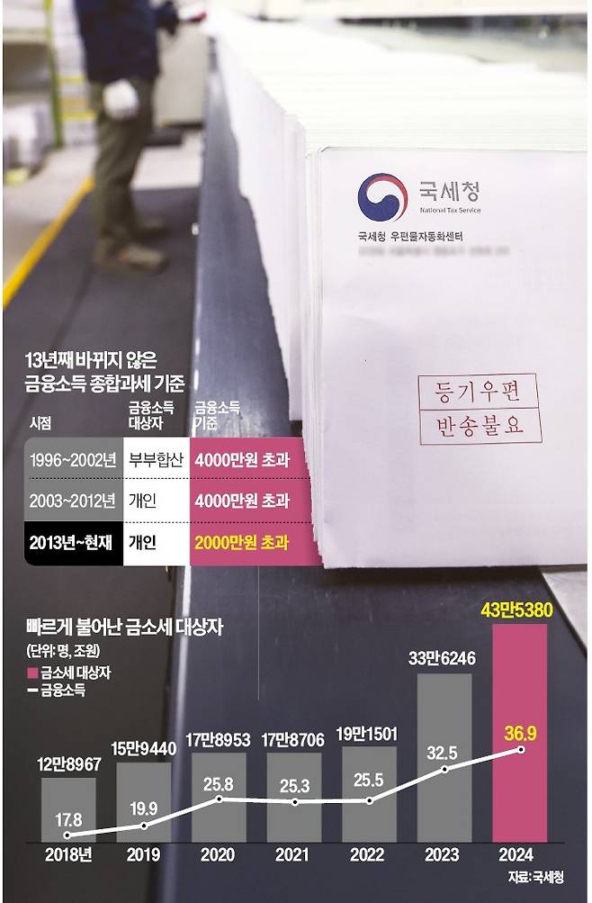 금융소득종합과세(금소세)처럼 ‘부의 재분배’를 목적으로 도입된 ‘부자세’가 사실상 ‘중산층 세금’으로 변질되고 있다. 25일 국세청 국세통계포털에 따르면 금소세 대상자는 2024년 전년 대비 29.5%(9만9134명) 늘어난 43만5380명으로 처음 40만 명을 넘어섰다. 최근 10년 새 네 배 가까이 늘었다. 경제 규모가 커지면서 가계의 자산·소득도 늘었지만 금소세 과세 기준은 13년 넘게 그대로 유지된 영향이다.