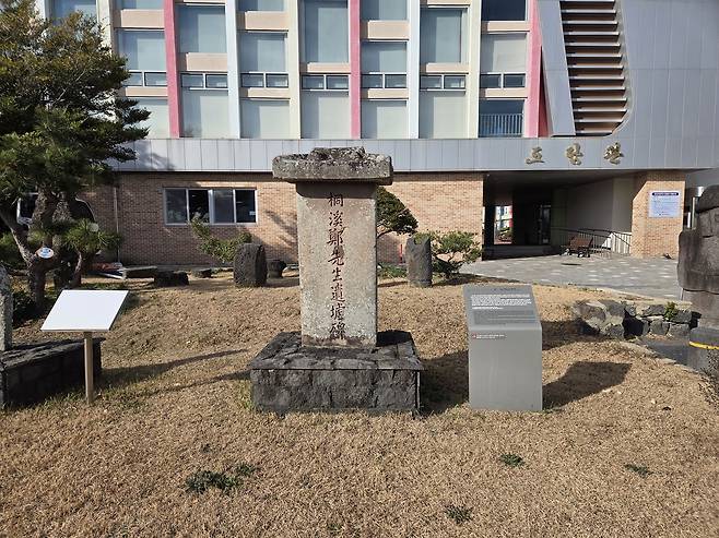 | ▲ 동계정선생유허비 대정읍성 안 초등학교 교정에 서 있는, 동계 정온 선생을 기리는 비석이다. 동계 정온은 '제주 오현' 중 한 분이다. |