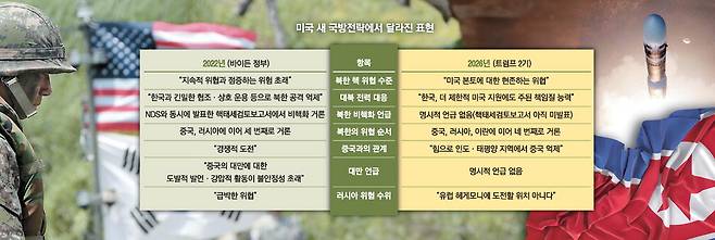 이는 2022년 조 바이든 행정부 시절 작성된 NDS보다 훨씬 더 북한의 위협 수준을 높이 평가한 것이다. 당시 NDS는 북한을 "중국, 러시아와 같은 규모의 경쟁 상대는 아니다"고 표현했고, 북한의 핵·탄도미사일·화학무기 등이 미국 본토와 인도·태평양 지역에 "지속적인 위협과 점증하는 위험을 초래할 수 있다"고 경고하는 수준이었다.
