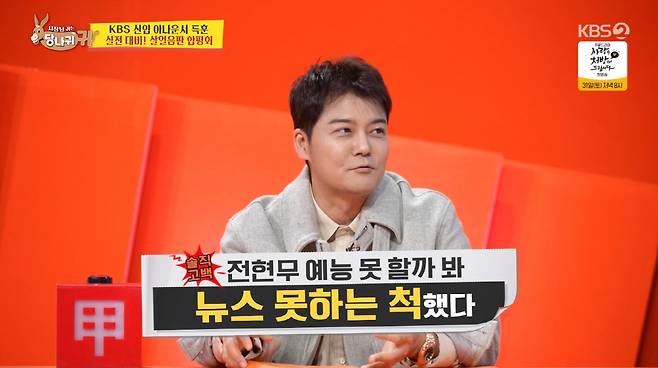 이 과정에서 전현무는 '가장 많이 받았던 지적'에 대해 "진중함이 떨어진다고 하더라"라고 말해 폭소를 자아냈다. 그때 엄지인 아나운서는 "전현무 선배 뉴스 잘했다"라고 언급, 그러자 뉴스 채널에 있다가 KBS에 입사한 전현무는 "솔직하게 이야기하겠다. 뉴스를 잘하면 예능 못할까 봐 뉴스를 안 했다"고 솔직하게 털어놨다. 이어 그는 "뉴스를 많이 했다. 하루에 4,5개씩 했다. 근데 입사 후 뉴스만 할까 봐 더 못하는 척 한 것도 있다"면서 신입부터 쌓아온 예능 올인 면모를 드러냈다.