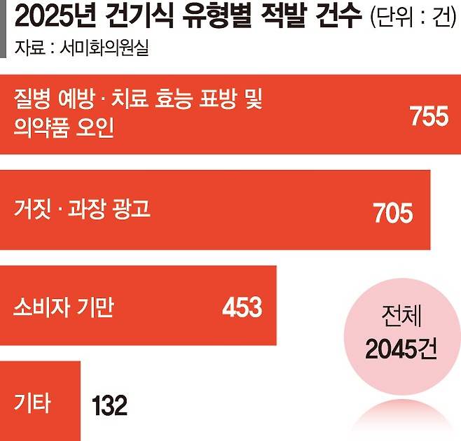 위반 유형별로는 '질병 예방·치료 효능 표방 및 의약품 오인' 사례가 755건으로 전체의 36.9%를 차지해 가장 많았다. 이어 '거짓·과장 광고'가 705건(34.4%), '소비자 기만'이 453건(22.1%)으로 뒤를 이었다.