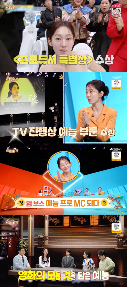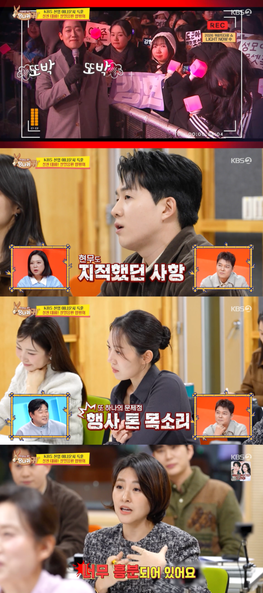 다음으로 엄지인 아나운서는 KBS 새로운 신입 아나운서들을 소개했다. 엄지인은 지난해 연말 시상식에서 받은 ‘프로듀서 특별상’에 이어 또 하나 좋은 소식이 있다고. 그는 “2025 한국아나운서대상에서 ‘KBS 사당귀 아나운서팀’이 TV 진행상 예능 부문을 수상했다. 단체상을 받았다”고 자랑했고, 엄지인 아나운서는 새 예능프로그램 진행을 맡게 됐다고 전했다.