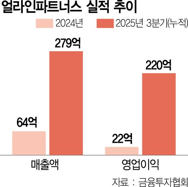 25일 금융투자 업계에 따르면 얼라인은 지난해 3분기까지 누적 매출액 279억 원, 영업이익 220억 원을 기록한 것으로 집계됐다. 이는 2024년 연간 매출액 64억 원, 영업이익 22억 원 대비 대폭 뛴 수치다. 4분기 실적까지 고려하면 1년 만에 영업이익이 10배 이상 폭증했을 것이란 관측이 나온다. 업계 관계자는 “얼라인이 지난해 청산한 펀드들의 수익률이 워낙 높아 많은 성과 보수를 받았다”고 말했다.