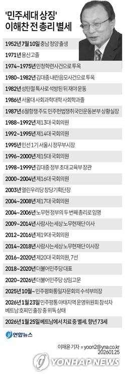 (서울=연합뉴스) 이재윤 기자 = 참여정부에서 국무총리를 지낸 이해찬 민주평화통일자문회의 수석부의장이 25일 베트남에서 치료 중 별세했다고 민주평통이 밝혔다. 향년 73세.