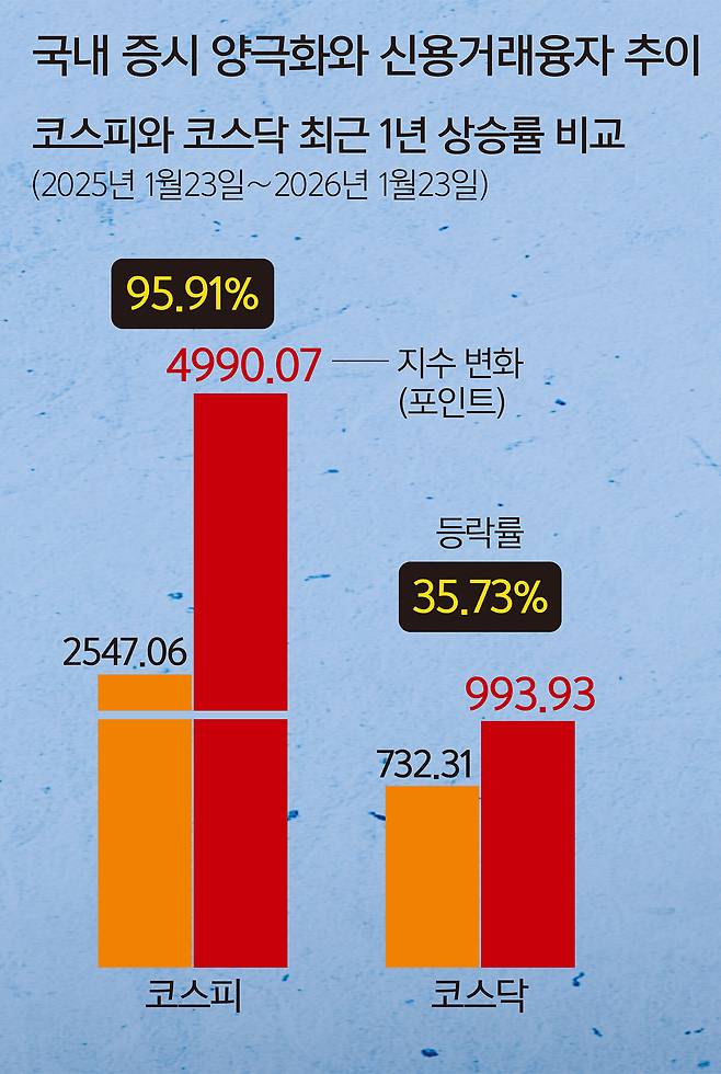 코스피가 사상 첫 5000 시대를 열었지만 반도체 등 일부 주도주에만 매수세가 집중되는 극심한 쏠림 현상 탓에 개인 투자자들의 소외감은 오히려 커지고 있다. 지수 상승분이 소수 대형주에만 집중되면서 시장 전반에 온기가 확산하지 못한 결과다. 이에 뒤처진 수익률을 만회하거나 뒤늦게라도 상승장에 편승하려는 심리가 겹치며 ‘빚투’(빚내서 투자) 규모가 사상 최대 수준으로 급증해 향후 증시 조정 시 뇌관으로 작용할 수 있다는 우려가 나온다.