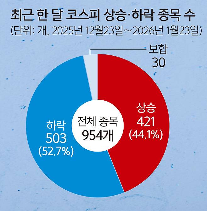 세계일보가 A 대형증권사에 의뢰해 고객 계좌를 분석한 결과, 자산 100만원 이상 고객 중 삼성전자·SK하이닉스와 지수 추종 상품(KODEX200·KODEX레버리지) 보유금액이 전체 주식 보유자산의 30% 이상인 비중은 16.2%에 그쳤다. 자산의 절반(50%) 이상을 이들 종목에 집중한 투자자 역시 11.5%에 머물렀다. 특히 20대(13.0%)·30대(12.4%)의 30% 이상 보유 비율이 60대 이상(20.1%)의 절반 수준에 머물러, 청년층이 느낀 상대적 박탈감이 더 컸음을 시사했다. 최근 한 달 사이 코스피가 가파르게 오르는 동안에도 하락 종목(503개)이 상승 종목(421개)보다 많았다.