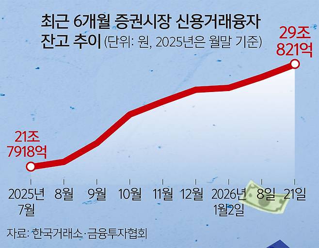 금융투자협회에 따르면 유가증권시장과 코스닥시장의 신용거래융자 잔고는 21일 기준 29조821억원으로 30조원 돌파를 목전에 뒀다. 지난해 7월 21조원대였던 신용잔고는 연말 27조원대로 올라선 뒤, 새해 들어 불과 3주 만에 2조원 가까이 급증했다. 단기간에 지수가 급등하자 추가 상승을 기대한 추격 매수 자금이 대거 유입된 결과다.