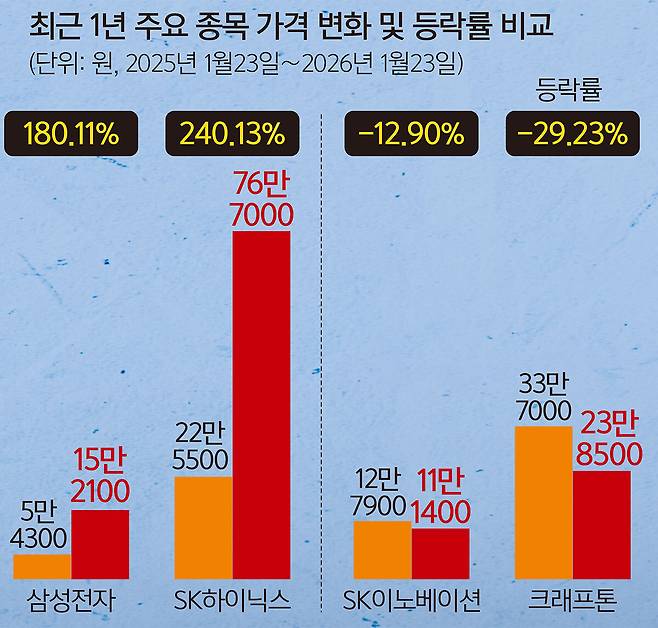 코스피 지수는 지난해부터 두 배가량 뛰었지만 특정 종목 쏠림은 심화했다. 25일 한국거래소에 따르면 코스피는 이달 23일 기준 1년 전에 비해 95.91% 상승했다. 전체 시가총액은 2056조889억원에서 4125조5551억원으로 2000조원 넘게 증가했는데, 이 중 반도체 투톱인 삼성전자와 SK하이닉스의 시총 합산은 약 1000조원 늘어 상승분의 절반을 차지했다. 전체 시총에서 두 종목이 차지하는 비중도 23.4%에서 35.4%로 확대했다. 이런 쏠림 구조 탓에 해당 종목을 갖고 있지 않은 투자자로서는 활황장의 훈풍을 체감하기 어려웠던 것이다.