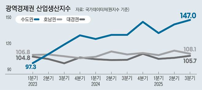 수도권과 지방의 산업 현장 온도가 극명하게 갈리고 있다. 수도권은 반도체 등 첨단 산업을 앞세워 산업생산지수가 큰 폭으로 뛴 데 반해 전통 제조업 비중이 높은 호남과 대구·경북은 지지부진한 모습을 보이면서 격차가 관련 통계 집계 이후 가장 큰 폭으로 벌어졌다.