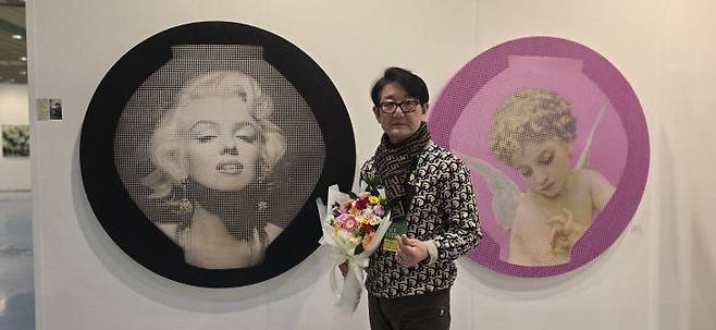 서울 코엑스에서 열린 아트페스타에서 김중식 작가가 작품들 앞에서 포즈를 취하고 있다. 사진 한성일 기자