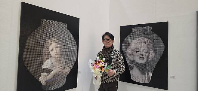 김중식 작가가 그의 작품 달항아리와 오드리 햅번, 달항아리와 엘리자베스 테일러 앞에서 포즈를 취하고 있다. 사진 한성일 기자