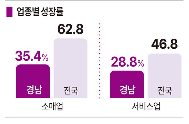 하지만 경남은 달랐다. 같은 기간 경남의 소매업 증가율은 35.4%, 서비스업 증가율은 28.8%에 그쳤다. 전국 평균의 절반 수준이다. 보고서는 이를 두고 “비수도권 도 단위 지역은 소매업 비중 증가가 미미하거나 오히려 감소하여, 소비 기반 확장 없이 전통 업종의 경쟁이 약화하는 구조적 취약성을 보인다”고 진단했다.