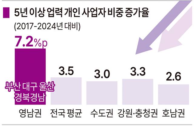 ◇업력 장기화 전국 최악= 경남 자영업의 세 번째 위기는 구조 경직화다. 가장 극명하게 드러나는 지표는 5년 이상 업력을 가진 사업자의 비중 증가다. 보고서에 따르면 영남권(부산, 대구, 울산, 경북, 경남)의 5년 이상 업력 사업자 비중은 지난 2017년 대비 2024년 7.2%p 증가했다. 이는 전국 평균 3.5%p보다 훨씬 높고, 수도권(3.0%p), 강원·충청권(3.3%p), 호남권(2.6%p)보다도 압도적으로 높은 수치다.