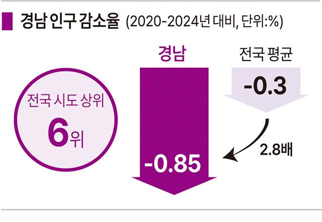 ◇인구 감소의 늪, 내수 기반 자체가 무너진다= 경남의 위기는 인구 감소에서 시작된다. 보고서에 따르면 지난 2020년부터 2024년까지 경남의 인구증감률은 -0.85%로, 전국 평균 -0.30%의 2.8배에 달하는 감소율을 기록했다. 경남은 경북(-1.04%), 부산(-0.94%), 전북(-0.92%) 등과 함께 전국에서 인구 감소율 상위 6위권에 속한다.