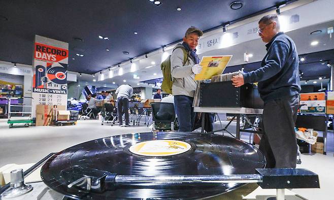 네이버 오디오카페인 하이파이코리아와 21개 서울 주요 LP·음반 판매업체가 참여한 ‘RECORD DAYS in SEOUL’ 행사가 열린 25일 서울 용산구 전자랜드에서 시민들이 LP를 살펴보고 있다. 24일부터 양일간 열린 이번 행사는 국내 음악과 음반 시장 활성화를 위해 국내 정상급 셀러가 한자리에 모여 K팝과 대중가요, 팝, 클래식, 재즈, 영화음악 등 다양한 장르의 신품과 중고 LP·CD를 선보이는 플리마켓 형태이다. 이달부터 매월 한 차례씩 마지막주 주말에 열린다.