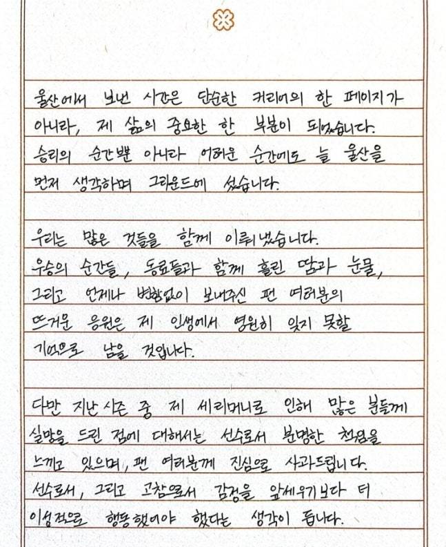 무엇보다 홈과 원정을 가리지 않고 언제나 같은 마음으로 응원해주신 울산 팬 여러분께 진심으로 감사드립니다. 좋은 순간뿐 아니라 힘든 순간에도 변함없이 곁을 지켜주신 그 응원은 제게 큰 힘이었습니다. 팀을 떠난 이후에도 팬 여러분께서 보내주신 그 마음은 제게 오래 기억될 것입니다.