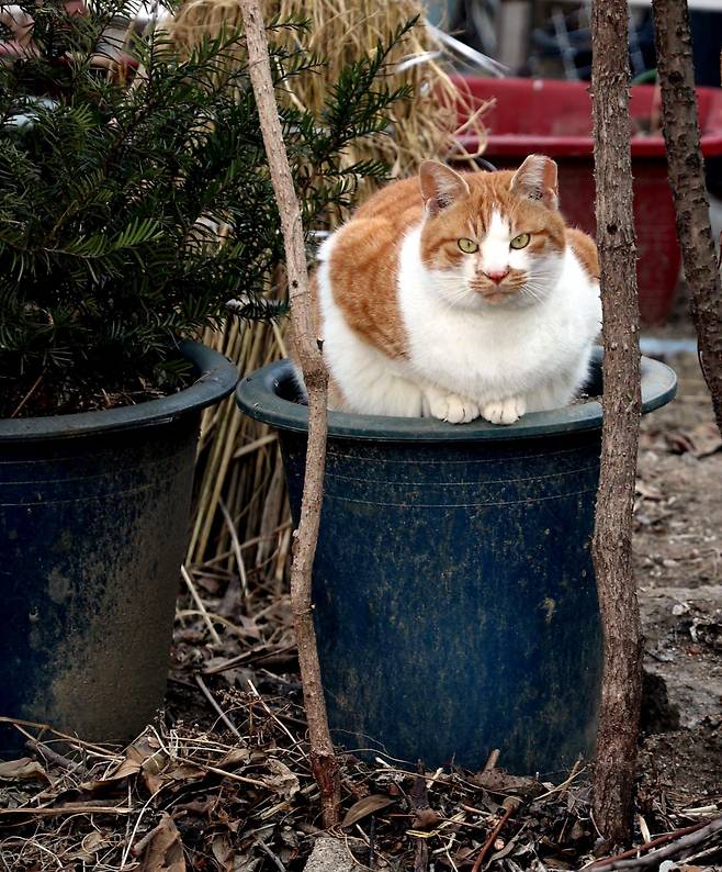 냥이가 엉덩이를 들이밀어 빈 화분에 자리를 잡았습니다. 봄비가 싹을 깨운다는 우수(雨水)가 되면 흙에서 움트는 새 생명에게 양보할 거죠?