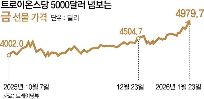 국제 금 가격이 트로이온스(약 31.1g)당 5000달러(약 727만6500원) 돌파를 눈앞에 두고 있다.