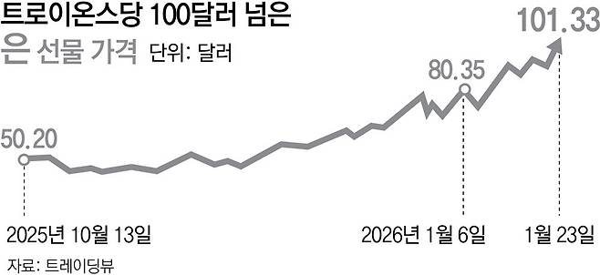 금·은 가격이 꾸준히 오르는 이유는 글로벌 외환시장에서 정치적 불확실성이 해소되지 않고 있기 때문이다. 도널드 트럼프 미국 대통령이 그린란드 병합 구상을 밝힌 뒤 유럽 국가들에 관세 부과를 위협한 데 이어 제롬 파월 연준 의장을 상대로 해임 압박 수위를 높이면서 ‘셀 아메리카’(미국 자산 매도) 심리가 퍼지고 있다.