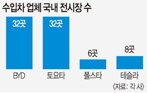 이 같은 확장 속도는 기존 수입차 브랜드와 비교해도 이례적이다. BYD는 전시장 수 기준으로 토요타와 같아졌고, 포드(25곳)와 폭스바겐(22곳), 혼다(10곳)는 이미 넘어섰다. 볼보(39곳)와 아우디(33곳)를 바짝 추격하고 있다. 온라인 판매 중심 전략을 유지하는 테슬라는 국내 오프라인 스토어가 8곳에 불과하며, 전기차 브랜드 폴스타는 6곳의 전시장을 운영 중이다.