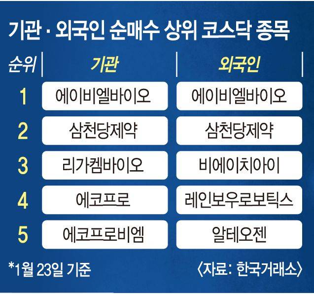 기관은 최근 주가가 급락한 바이오주를 중심으로 ‘줍줍’에 나섰다. 23일 기관이 가장 많이 산 종목은 에이비엘바이오(621억원)다. 알테오젠 여파로 10% 넘게 급락한 에이비엘바이오는 기관 주도 매수세에 10.24%나 급등했다. 코스닥 바이오주는 시가총액 1위 알테오젠이 글로벌 빅파마 머크에게서 받기로 한 로열티 조건이 예상을 밑돌자 21일 동반 급락했었다.
