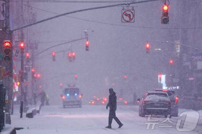 (뉴욕 로이터=뉴스1) 류정민 특파원 = 25일(현지시간) 미국 전역에 겨울 눈폭풍이 몰아친 가운데 한 남성이 뉴욕 타임스퀘어 인근 도로를 건너고 있다. 2026.01.25.