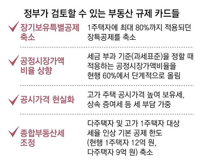 이 대통령은 이날 양도세 중과로 오히려 매물이 줄어들 것이라는 전망엔 “팔면서 내는 세금보다 들고 버티는 세금이 더 비싸도 그렇게(보유) 할 수 있을까”라고 밝히는 등 보유세 인상도 검토할 수 있다는 뜻을 내비쳤다. 윤석열 정부에서 완화한 공정시장가액비율 상향과 종합부동산세 기본 공제 한도 축소 가능성이 거론된다. 현행 60%인 공정시장가액비율을 80% 이상으로 상향 조정하면 공시가격 20억 원 주택 보유자의 종부세가 약 330만 원에서 480만 원 수준으로 즉시 상승하는 등 보유세 부담이 현실화된다.