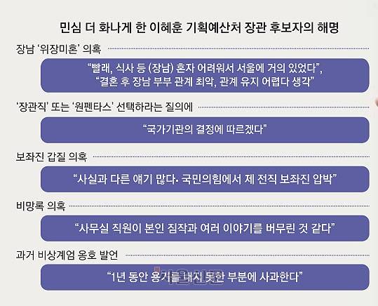 특히 이 후보자는 서울 서초구 ‘래미안 원펜타스(전용 137㎡)’ 청약에서 장남의 위장 미혼·전입 의혹과 관련해 당시 아들 부부가 ‘파경 위기’였다는 등 납득이 가지 않는 해명을 하면서 여론이 더 악화됐다. 이 문제가 부동산과 공정 이슈로 계속 확산되면 지방선거에도 악영향을 미칠 것이란 우려까지 고려한 것으로 풀이된다.