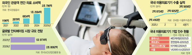 이러한 미용의료 시장의 선봉장에 선 것은 국내 기업들이다. 특히 국내 미용의료 기업들은 의료관광 활성화로 인한 내수 확대의 수혜를 누렸다. 한국관광공사 데이터랩에 따르면 외국인 관광객의 연간 의료 소비액은 2021년 1196억 원에서 2025년 2조 796억 원으로 약 17배 수준이 됐다. K뷰티의 인기와 상대적으로 저렴한 시술 비용, 패키지 시술 등 국내 병원들의 마케팅 전략 등이 맞물린 결과다.
