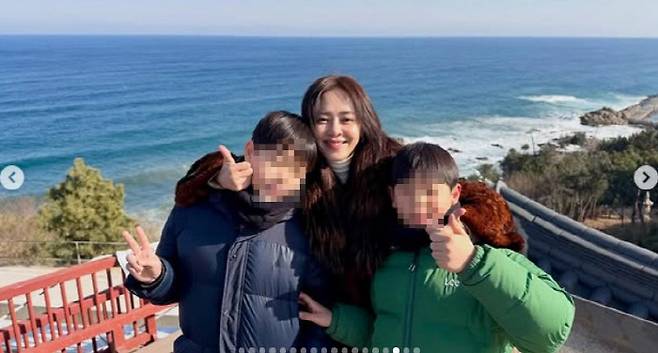 사진 속 강성연은 겨울 바다를 배경으로 두 아들과 함께 환한 미소를 지으며 포즈를 취하고 있다.