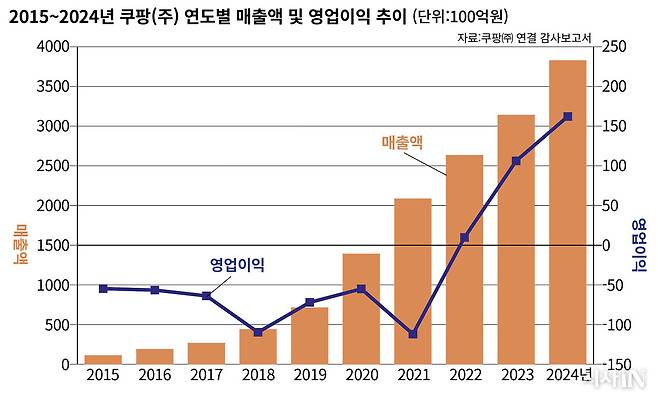2010년 하반기 출범한 쿠팡㈜는 물류 인프라에 공격적인 대규모 투자를 연이어 퍼부었다. ‘로켓배송’ ‘새벽배송’ ‘당일배송’ 등 혁신적 서비스로 한국의 유통시장을 전복시킨 비결이다. 그러나 매출 증가는 투자의 속도를 따라잡지 못했다. 그 결과는 ‘장기 적자’였다. 〈시사IN〉은 2015~2024년 쿠팡㈜의 연결 감사보고서를 분석했다. 그에 따르면, 이 회사는 영업이익 기준 2015년부터 2021년까지 7년 연속 적자를 기록했다. 이 시기 쌓인 당기순손실은 5조8000억여 원의 누적적자(결손금)로 남았다.