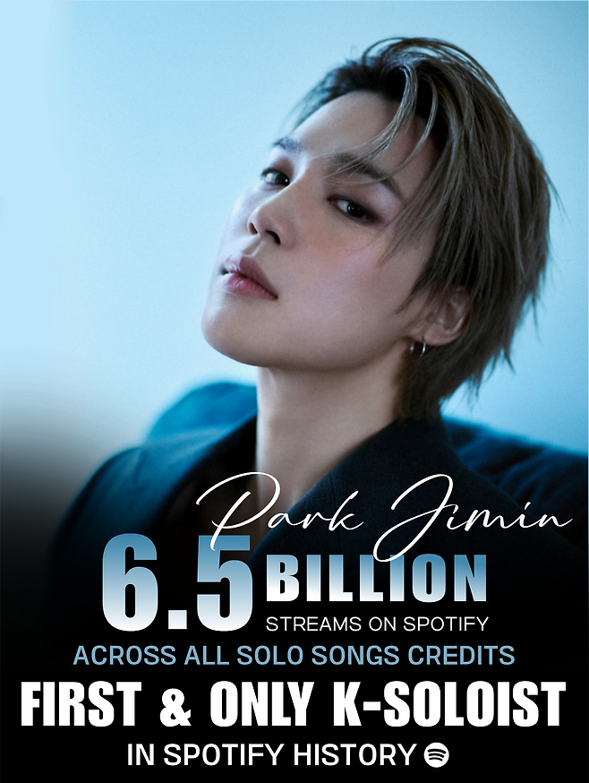 방탄소년단(BTS) 지민이 세계 최대 음원 플랫폼 스포티파이에서 의미 있는 이정표를 세웠다. 지민은 협업 없이 발표한 순수 솔로곡 22곡만으로 누적 65억 스트리밍을 기록했다. 이는 K팝 솔로 가수 가운데 최초이자 유일한 성과다.